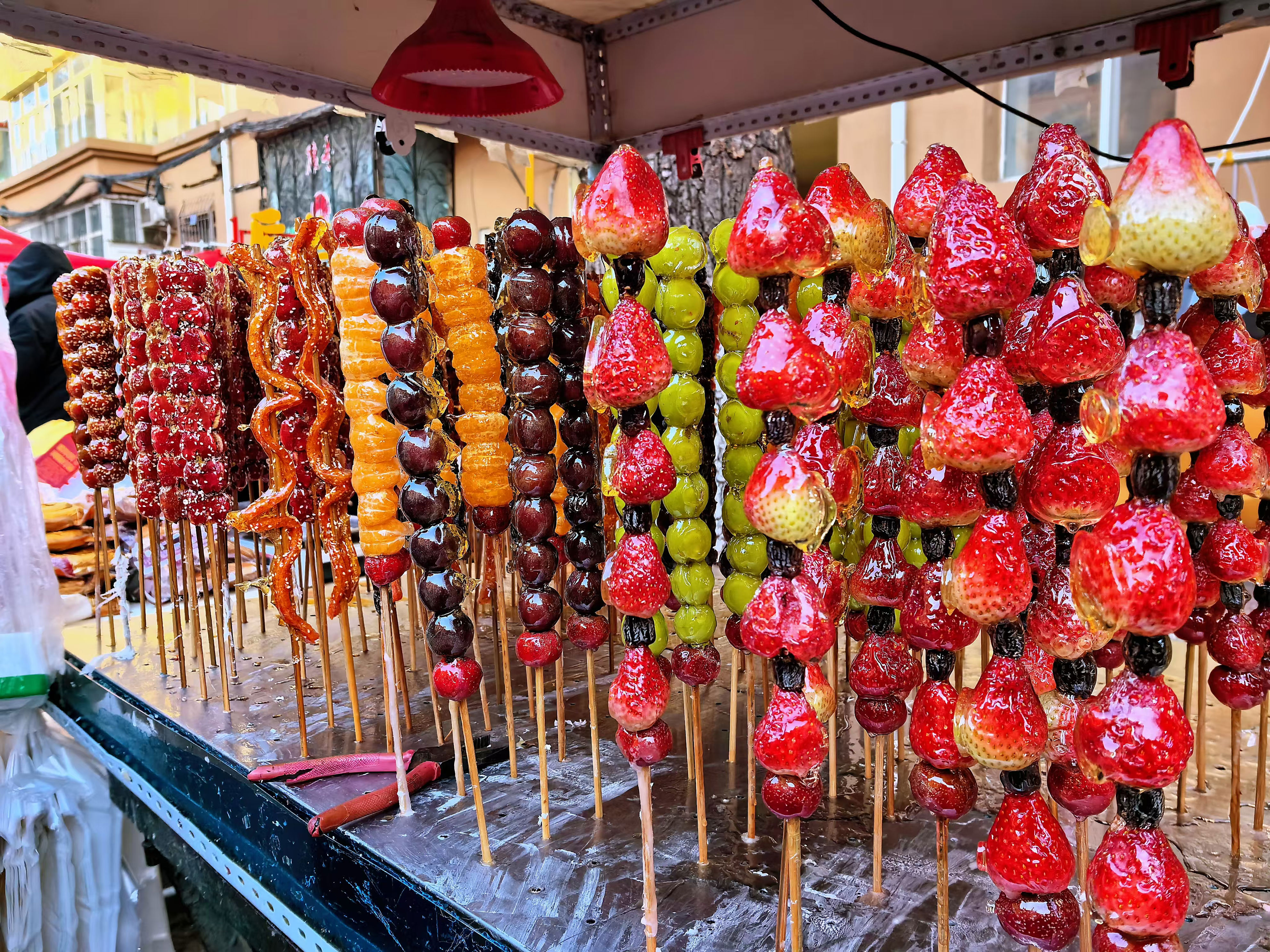 糖葫芦、大冻梨、油炸糕……摊主们的吆喝声此起彼伏,各种小吃香味扑鼻。