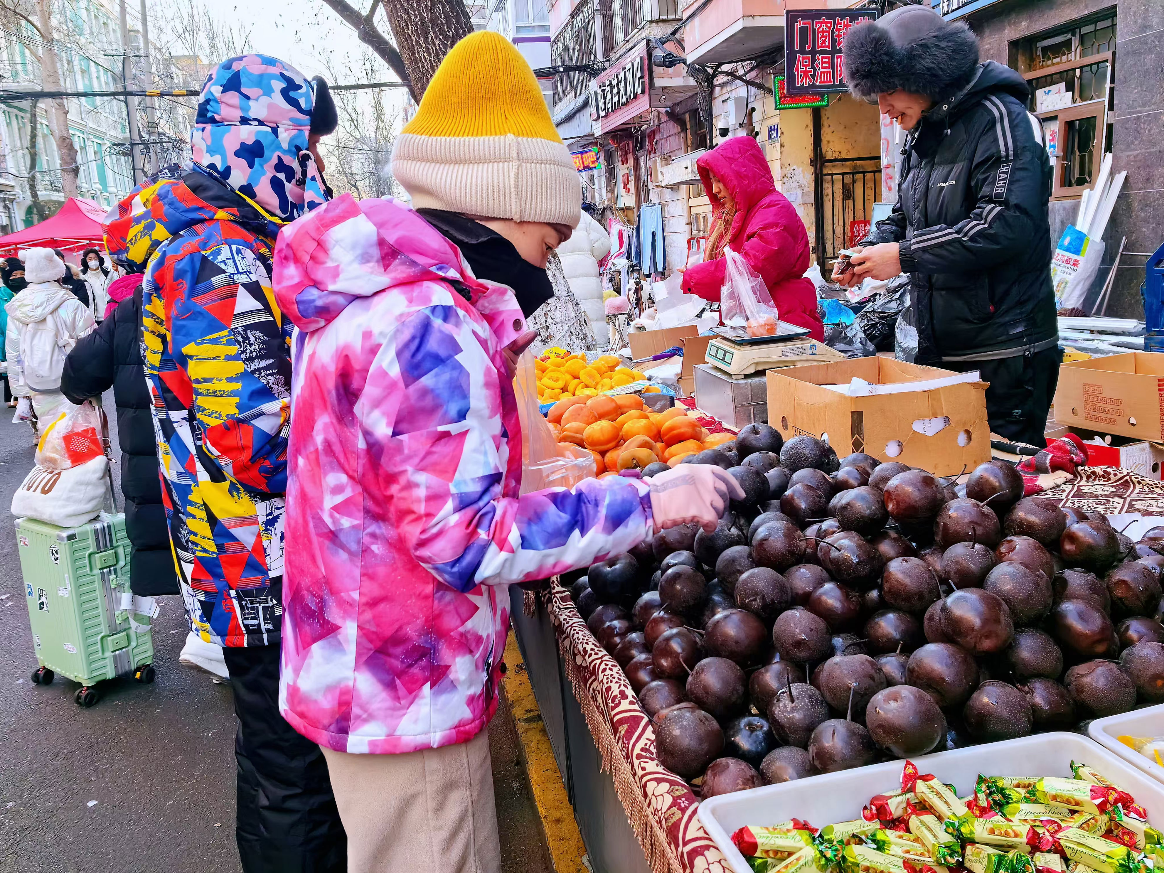 游客们不知道冷冻的黏豆包是啥,没关系,直接上屉蒸熟了卖,甜甜的红豆味顺着热气飘散开来,十分诱人,摊主还会贴心地为游客摆好一碟白砂糖;冻梨、冻柿子不知道怎么吃,不怕,摊主已经用水为你缓好,直接嗦就行……